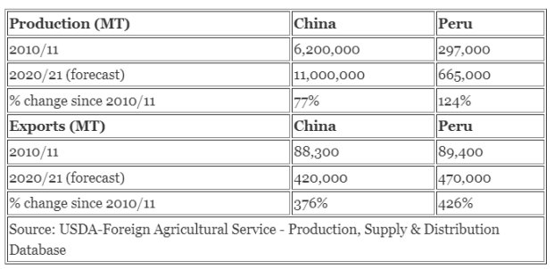 在过去的 5 年中,全球消费量也增长了 10%,而秘鲁的消费量平均约占国内可用供应量的三分之二。