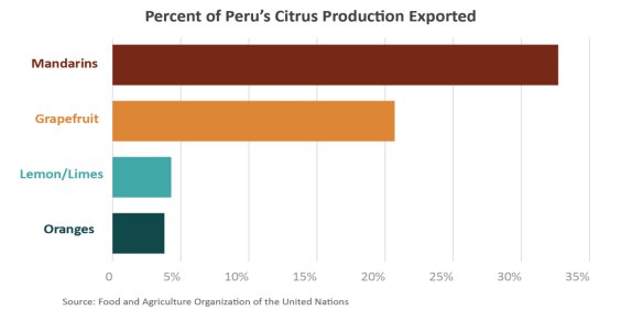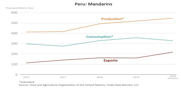 U.S. demand for mandarins continues to grow with consumption increasing by nearly one-third during the last 5 years. The EU-28 is the second largest destination with more than 25 percent of the exports in 2020. The marketing season for Peru’s mandarins ranges between March and October each year, which provides a window of opportunity for export during the Northern Hemisphere counter-season.