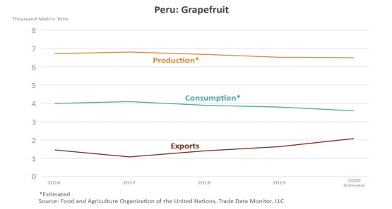 Although only about one-quarter percent of global exports, Peru’s grapefruit exports have gone up more than 40 percent since 2016 with the United States as the top market and China close behind. Grapefruit production in Peru is a very small portion of global production with area harvested averaging around 850 hectares. Consumption in Peru has averaged just under 60 percent of available supply. The marketing season for Peru’s grapefruit ranges between June and September, which, similar to oranges and mandarins, provides a window of export opportunity during the Northern Hemisphere counter-season.
